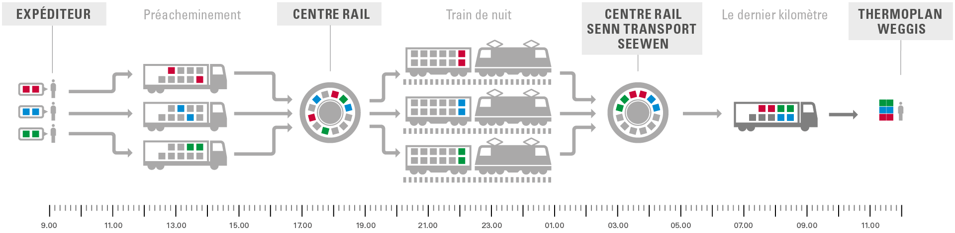 Les amateurs de café du monde entier apprécient les machines à café Thermoplan. L’entreprise les assemble dans son usine à Weggis à partir de centaines de composants. Quatre cinquièmes d’entre eux proviennent d’entreprises industrielles implantées en Suisse. En tant que nouveau partenaire logistique de Thermoplan, nous récupérons des composants auprès de 25 fournisseurs installés aux quatre coins du pays avant le montage des distributeurs de café entièrement automatiques. Nous les transportons ensuite jusqu’à la plateforme de transbordement reliée au réseau ferré la plus proche. De là, un train de nuit les amène à notre centre rail de Seewen où ils sont transbordés, re-groupés puis livrés en juste à temps à Thermoplan. Nous réduisons les distances grâce à la proximi-té régionale, ce qui permet à tous les acteurs/-trices du processus de gagner en réactivité.