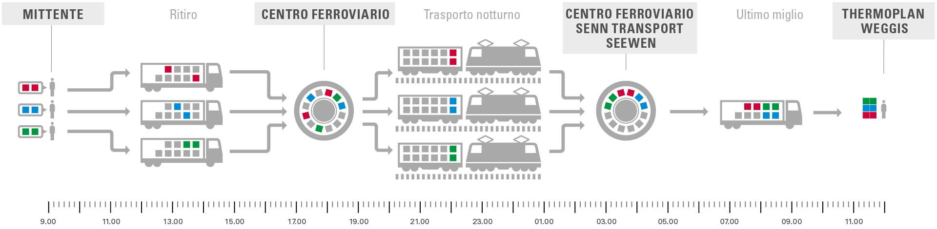 Le macchine da caffè di Thermoplan sono apprezzate in tutto il mondo e vengono realizzate assemblando centinaia di componenti nello stabilimento di Weggis. Quattro quinti di questi componenti provengono da aziende manifatturiere svizzere. In qualità di nuovo partner logistico di Thermoplan, preleviamo componenti per l’assemblaggio di macchine da caffè completamente automatiche da circa 25 fornitori in tutta la Svizzera e li trasportiamo alla piattaforma di smistamento più vicina con un collegamento ferroviario. Da qui la merce raggiunge il nostro centro ferroviario di Seewen con il trasporto notturno, per poi essere trasbordata, raggruppata e consegnata a Thermoplan puntualmente, just in time. Grazie alla prossimità regionale, le distanze sono più brevi, il che aumenta la velocità di reazione di tutti i soggetti coinvolti.